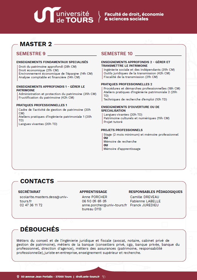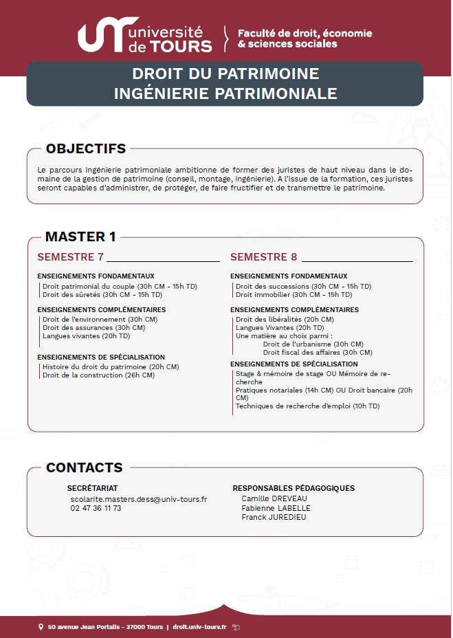 Le parcours ingénierie patrimoniale a été créé en 2018 par Camille Dreveau et Fabienne Labelle dans une logique de complémentarité avec le parcours promotion et gestion de l’immeuble afin de répondre à une demande forte des professionnels, banques et notariat en particulier. Le master ingénierie patrimoniale propose ainsi aux étudiants une formation à la fois théorique et pratique de haut niveau, en adéquation avec les besoins du monde professionnel, facilitant l’insertion des étudiants sur le marché de l’emploi. Voici ces atouts en quelques mots : Les apprentissages sont progressifs sur les quatre semestres du master. La deuxième année accentue la spécialisation. Le socle juridique et fiscal incontournable est complété par des enseignements permettant aux étudiants de maîtriser savoirs et outils professionnels et relationnels. L’accent est porté sur la mise en pratique des connaissances. L’apprentissage ou le stage d’une durée de deux à cinq mois en formation initiale, les ateliers pratiques, les projets tutorés en font une formation très professionnalisante. L’autonomie, la prise d’initiatives et de décisions, le travail collaboratif sont valorisés. Les mises en situation pratique répétées permettent aux étudiants de progresser rapidement. L’équipe enseignante, disponible et investie, est composée d’universitaires spécialisés dans les questions patrimoniales et de professionnels aux profils diversifiés et complémentaires (conseillers en gestion de patrimoine du secteur bancaire ou indépendants, notaires, avocats, chargés d’affaires, etc.). Le master ingénierie patrimoniale s’appuie sur de nombreux partenariats sur le plan local et national. Enfin, la dynamique association « Patrimonium » contribue à l’épanouissement et à la cohésion du master et de ses étudiants. Intégrer le master ingénierie patrimoniale de Tours, c’est choisir une formation performante pour réussir et s’insérer rapidement dans la vie active. Nous nous tenons à votre disposition pour répondre à vos questions.